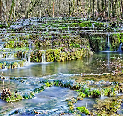Da die Schüttung der Quelle sehr stark auf Starkregenereignisse reagiert und auf diese unmittelbar "anspringt", kam es in den letzten Jahren immer wieder zu sehr starker Strömung, die leider nicht nur Ablagerungen aus den Becken ausgeschwemmt haben, sondern zum Teil auch zu Ausspülungen unter dem Kalktuff und zum durchbrechen der Tuffschicht geführt haben. Das Problem ist auch, dass sich der Kalktuff über die Jahre immer höher aufbaut und dann bei Hochwasser das Wasser "neue Wege" außerhalb des Bachbettes findet...